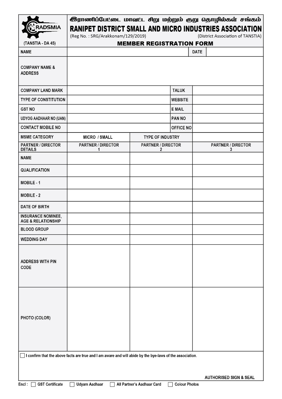 The Ranipet District Small and Micro Industries Association (RADSMIA) is a premier industry body dedicated to the promotion, protection, and growth of MSMEs in Ranipet District. When Ranipet District was newly formed in November 2019, RADSMIA became the first MSME association to be officially registered in the district. It is an affiliated association of TANSTIA – the apex body for MSMEs in Tamil Nadu – and proudly represents the MSME sector of Ranipet as its recognized district-level association. In addition, RADSMIA has been playing an active role as a member of the Task Force and Steering Committee constituted under the Ranipet District Administration, covering all industry-related sectors.